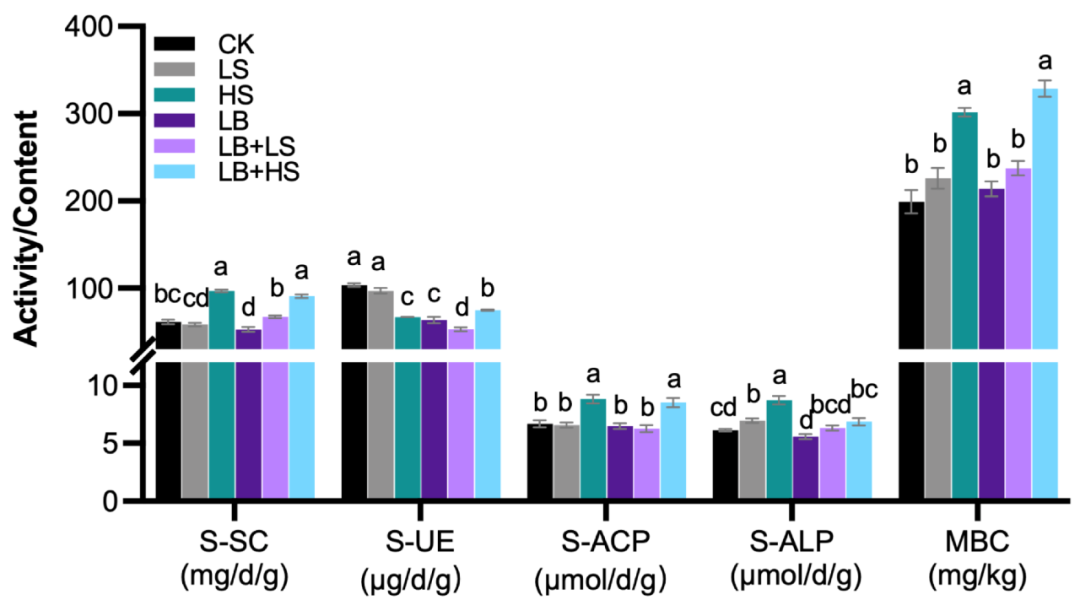 然而,與根際土壤相比,大塊土壤中的硝酸鹽氮(NO3-N)異常高(33.19 ± 2.98 mg/kg),這表明根際微生物對氮的利用率很高。此外,HS根際土壤中有效磷和總磷的量顯著(zhù)增加,這表明在沒(méi)有任何PGPM的情況下添加高蔗糖可能提供了磷轉化所需的碳。LB + LS處理顯著(zhù)增加了總鉀并降低了速效鉀,這表明根際土壤中鉀的利用率有所提高。普遍增加的碳和營(yíng)養物質(zhì)的可用性也將刺激微生物活動(dòng),而酶活性水平的提高證實(shí)了這一點(diǎn)(圖5)。