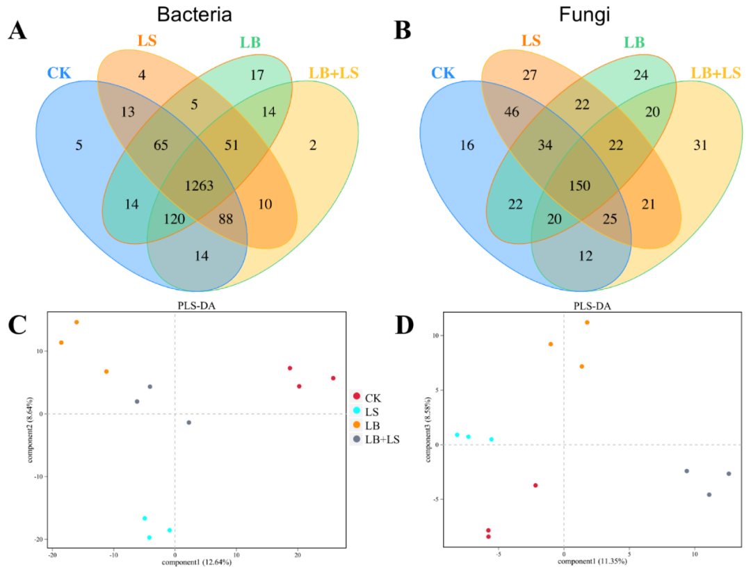 PLS-DA分析顯示,四種處理(CK、LS、LB 和 LB + LS)的樣品在細菌群落(分別占總變量的 12.64% 和 8.64%)和真菌群落中均分離良好(分別占總變量的 11.35% 和 8.58%)(圖 6C,D)。對于細菌,處理后的α多樣性雖然與CK相比差異不顯著(zhù),但豐富度指數(Ace和Chao1)和多樣性指數(Simpson,Shannon,PD Whole Tree除外)在處理中都減少了,特別是在LS土壤中。然而,CK和LB + LS之間的Simpson Index存在顯著(zhù)差異(p?= 0.0147)。