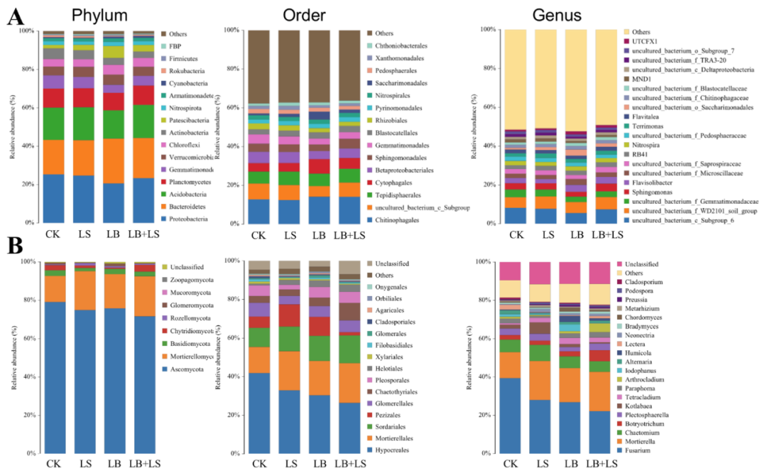 在分類(lèi)的真菌群落中(圖7B),AscomycotaMortierellomycota是兩個(gè)最豐富的門(mén),合計占總真菌序列相對豐度的92.5% 以上。最豐富的Ascomycota在CK (79.1%) 處理中富集最多,在 LB + LS (71.6%) 處理中減少最多。相比之下,在 LB + LS 處理下,通常排名第二的Mortierellomycota的豐度更高。此外,第三豐富的Basidiomycota似乎對添加蔗糖很敏感。有趣的是,Chytridiomycota的相對豐度在LS和LB處理中降低。在目水平上,Hypocreales最為豐富,接下來(lái)依次是Mortierellales、Sordariales、Pezizales、Glomerellales、Chaetothyriales?和?Pleosporales,它們是最主要的七種真菌。與CK相比,Hypocreales在所有處理中均下降。值得注意的是,盡管在LS和LB處理的土壤中Pezizales增加,但其豐度出乎意料地在LB + LS處理下最低。在屬水平上,與CK相比,所有處理的第一優(yōu)勢屬Fusarium減少,而第二優(yōu)勢屬Mortierella增加,其中LB+LS處理的增幅最大。簡(jiǎn)而言之,與細菌群落不同,真菌群落結構在 CK 與三種處理之間甚至在不同處理之間均發(fā)生了明顯變化。