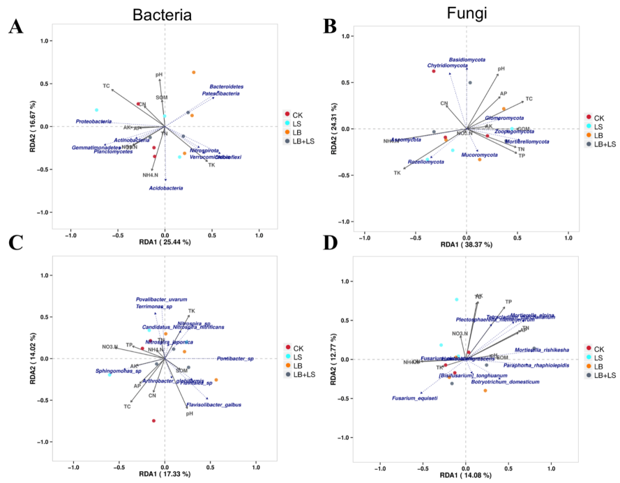 對于門(mén)水平的真菌,總群落組成與以下土壤理化性質(zhì)密切相關(guān):TK、NH4-N、TC、pH和TP(圖8B)。LS土壤以RozellomycotaMortierellomycota為主,其成員與TK和TP相關(guān)性最高,LB處理的土壤以Mortierellomycota、ZoopagomycotaMucoromycota為主,與 TP、TN和SOM相關(guān)性最高,以及LB + LS土壤以BasidiomycotaChytridiomycota為主,它們與土壤pH和C/N有關(guān)。