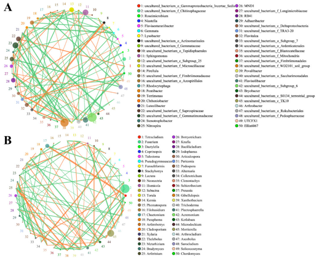 對最豐富的屬之間的Spearman相關(guān)系數進(jìn)行網(wǎng)絡(luò )分析(圖9),顯示出50個(gè)主要細菌和真菌屬之間的相關(guān)性。