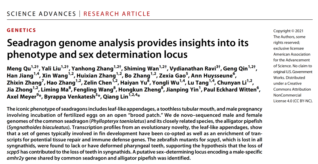而該項技術(shù)也已在多項合作案例中成功引用,如2021年中國科學(xué)院昆明植物研究所關(guān)于無(wú)刺光葉薔薇(月季)基因組學(xué)研究成果發(fā)表在國際期刊National?Science?Review(IF:17.275),探究了月季皮刺遺傳調控機制,為更好理解植物新性狀產(chǎn)生與維持機制提供了新視角;如2021年中國科學(xué)院南海海洋研究所關(guān)于草海龍基因組學(xué)研究成果發(fā)表在國際期刊Science?Advances(IF:14.136),揭示了海龍科物種性別決定基因的產(chǎn)生和演化歷程,為海洋魚(yú)類(lèi)的環(huán)境適應性進(jìn)化研究提供了重要理論依據。