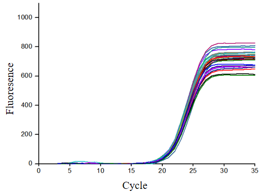 2.重復性檢測:分別設置30個(gè)復孔,擴增相同的基因,發(fā)現擴增曲線(xiàn)的Ct值幾乎一致。