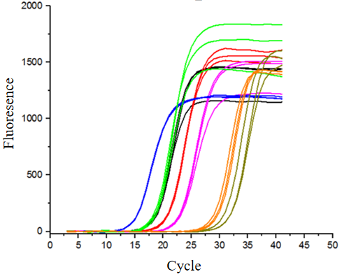 圖3:物種多樣性檢測:分別以不同物種、不同濃度的RNA為模板,進(jìn)行一步法RT-qPCR擴增。包括人肝癌(藍色);果蠅(綠色);小鼠腸道(黑色);番茄果(紅色);日本水稻(紫色);辣椒(橙色);石斑魚(yú)(灰色)。