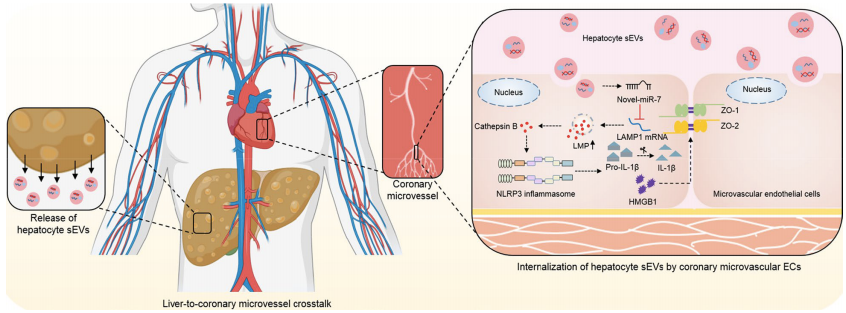 在本研究中,作者通過(guò)大量結論表明在NAFLD期間,冠狀動(dòng)脈微血管發(fā)生內皮細胞的高通透性。肝內脂質(zhì)水平的增強可誘導富含novel-miR-7的肝臟外泌體的分泌,通過(guò)調節LAMP1/組織蛋白酶B/NLRP3炎癥小體信號通路,促進(jìn)微血管內皮細胞的高通透性。此外,脂肪變性肝細胞是含有novel-miR-7外泌體的一個(gè)重要來(lái)源,而對novel-miR-7的基因抑制可以改善微血管內皮屏障的完整性。本研究為肝臟-心臟間器官交流的具體機制帶來(lái)了新的見(jiàn)解,并證實(shí)novel-miR-7有潛力成為冠脈微血管損傷的疾病標志物和治療靶點(diǎn)。