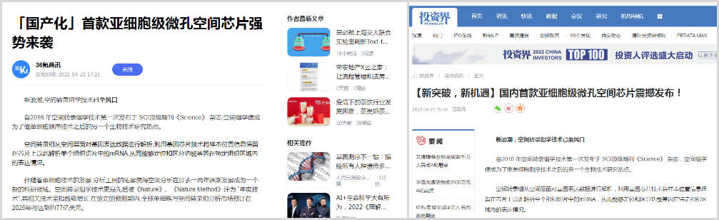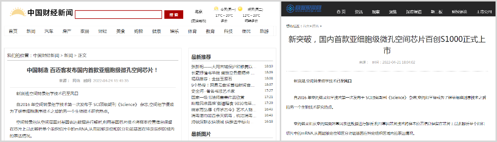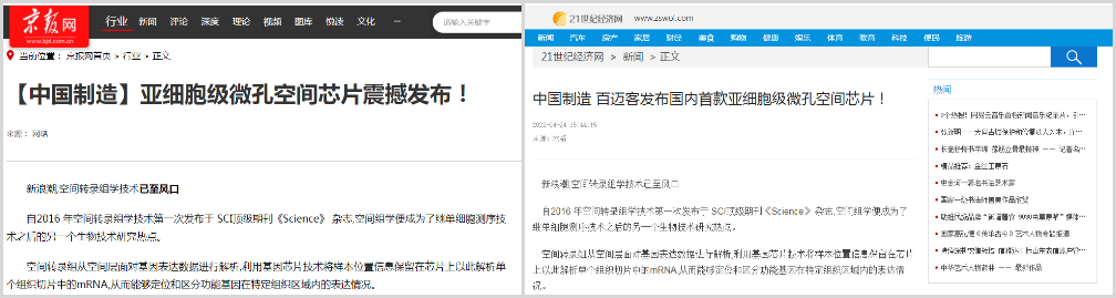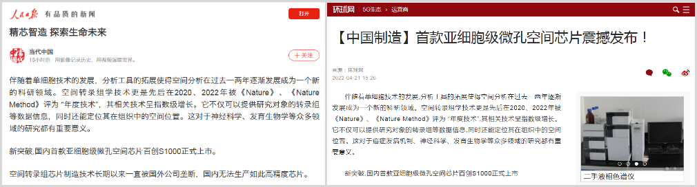 4月20日,百邁客生物在北京發(fā)布了亞細胞級微孔空間組學(xué)芯片“百創(chuàng )S1000”,該芯片可以讓研究者們可以結合不同階段圖譜數據,獲得全面的亞細胞級時(shí)空動(dòng)態(tài)表達圖譜,從而為疾病的診斷治療及藥物研發(fā)提供更有力的決策依據,相比目前國外空間轉錄組測序芯片精度提高了近400倍,同時(shí)還能拍攝高清HE染色圖片!