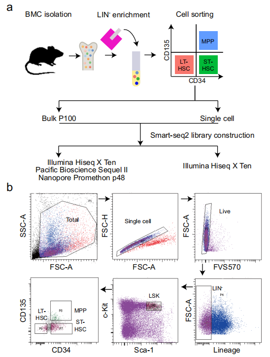 樣本制備:8-9周的雌性成年C57BL/6 J 小鼠,從股骨和脛骨中分離骨髓細胞。首先使用小鼠造血干細胞分離試劑盒富集造血干細胞和祖細胞(HSPC)。長(cháng)期(LT)和短期(ST)造血干細胞(HSC)和多能祖細胞(MPP)根據其表面標志物進(jìn)行分選。對于單細胞RNA測序(scRNA-seq),將細胞單獨分選到含有裂解緩沖液的8條PCR管中。同時(shí)對于批量RNA-seq,分選100個(gè)細胞(P100)到一個(gè)PCR管中作為生物學(xué)重復。