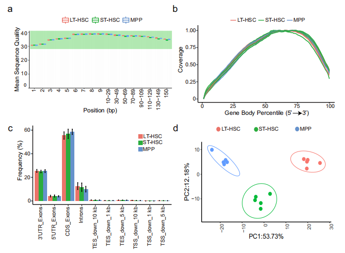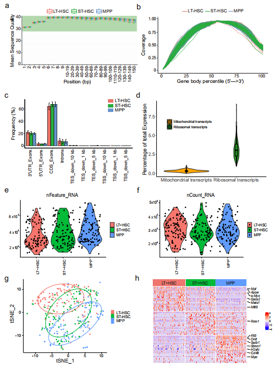 對于批量RNA測序,PCA分析顯示三種細胞類(lèi)型在PC1軸上分離,PC1的變異率為53.73%(圖3d)。與單細胞數據相似,ST-HSC位于LT-HSC和MPP之間,與它們的生物學(xué)狀態(tài)相對應。綜上所述,這些結果表明細胞被正確分選,批量和單細胞短讀長(cháng)RNA-seq數據的質(zhì)量都很高。