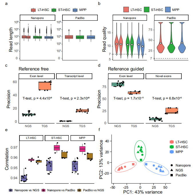 利用短讀長(cháng)下一代測序(NGS)或長(cháng)讀長(cháng)測序(如PacBio和Oxford Nanopore Technologies)的RNA測序,是解讀包括血細胞生成在內的各種生物過(guò)程中的轉錄多樣性和調控機制的強大工具。雖然NGS在表達定量方面更可靠,但是短讀長(cháng)在A(yíng)S事件中只能提供有限的信息。相比之下,長(cháng)讀長(cháng)的測序方法提供了一個(gè)獨特的機會(huì ),可以實(shí)現在提供全長(cháng)信息的基礎上檢測可變剪接異構體。本文使用短讀長(cháng)和長(cháng)讀長(cháng)RNA測序,在批量和單細胞水平上對小鼠HSC和MPP進(jìn)行了全面的轉錄圖譜分析。