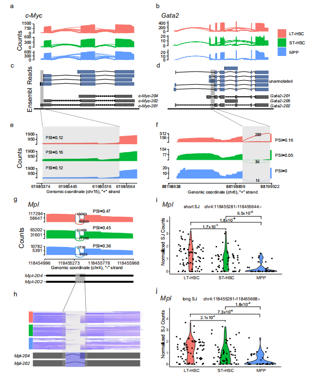 為了進(jìn)一步確認長(cháng)讀長(cháng)在識別可變剪接異構體方面的優(yōu)勢,使用納米孔和PacBio測序數據對三種細胞類(lèi)型中已知的LT-HSC的標志物c-Myc和Gata2(圖2h)的轉錄本進(jìn)行了可視化。接下來(lái)篩選了所有映射到基因c-Myc和Gata2及其注釋的轉錄本上的reads。發(fā)現2915個(gè)reads覆蓋到了c-Myc,且LT-HSC的reads數*多(圖6a)。在納米孔和PacBio測序數據中可視化了全長(cháng)轉錄本的reads,發(fā)現所有注釋的亞型都能被鑒定識別(圖6c)。在c-Myc第一個(gè)外顯子中發(fā)現了一個(gè)5 ‘的可變剪接起始位點(diǎn)。使用短讀長(cháng)測序數據來(lái)定量該基因座的剪接百分比(PSI),發(fā)現較長(cháng)的異構體在所有三種細胞類(lèi)型中具有相似的 PSI(剪接百分比),ST-HSC中包含第一個(gè)外顯子的較長(cháng)異構體的reads占比比較高(圖6 e)。對于Gata2來(lái)說(shuō),發(fā)現覆蓋有595個(gè)reads,在LT-HSC中比其他兩種細胞類(lèi)型多了近20倍的reads數(圖6b)。通過(guò)對比全長(cháng)reads和注釋的轉錄本,發(fā)現在LT-HSC中Ensembl的轉錄本中有一個(gè)未注釋的內含子保留(圖6d)。隨后利用短讀長(cháng)測序數據驗證驗證了這種內含子保留并定量這個(gè)內含子的PSI值,發(fā)現該內含子在LT-HSC中PSI值*高(圖6f)。接下來(lái)展示將長(cháng)讀長(cháng)測序與單細胞RNA-seq結合的數據示例,從長(cháng)讀長(cháng)測序數據中鑒定到了一個(gè)在Mpl中具有24 bp可變剪接區域的可5’剪接位點(diǎn)(A5)?;赟mart-seq2的測序數據發(fā)現這個(gè)剪接事件在不同細胞類(lèi)型中是差異的,其PSI值從LT-HSC,ST-HSC到MPP是依次遞減的(圖6g-j)。使用Smart-seq2數據可以觀(guān)察到單個(gè)細胞間的異質(zhì)性(圖6h),在造血過(guò)程中,所涉及的長(cháng)和短剪接位點(diǎn)(SJ)是被顯著(zhù)下調的(圖6i,j)。這些結果表明,整合短讀長(cháng)和長(cháng)讀長(cháng)測序有助于識別差異表達的異構體。