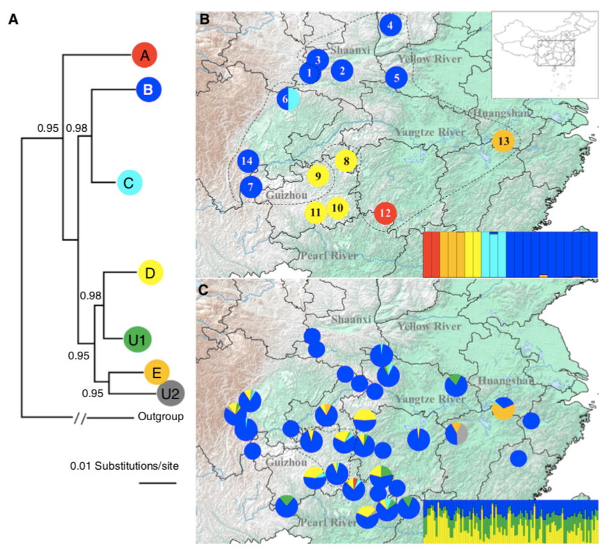 此外,2018年發(fā)表在Current Biology(IF = 10.814)的中國大鯢研究中,研究人員收集了70個(gè)野生地采集的1034個(gè)個(gè)體,通過(guò)SLAF-seq對中國大鯢的分類(lèi)進(jìn)行研究?;?3,159個(gè)SNPs位點(diǎn)和mtDNA的野生采集個(gè)體的遺傳多樣性分析顯示:中國大鯢至少具有5個(gè)明顯的分群(圖3)。此外還有一些未被鑒定的種(圖3:U1,U2)。譜系A-E,在4.71-10.25Mya間開(kāi)始分化,并與河流排水相關(guān)?;谵r場(chǎng)育種的中國大鯢個(gè)體的mtDNA和微衛星序列的遺傳多樣性分析顯示其具有廣泛的遺傳混合,特別是,漸滲種類(lèi)B來(lái)自陜西黃河流域。通過(guò)農業(yè)混種導致了分化于四百萬(wàn)年前的中國大鯢發(fā)生了雜交,這種雜交方式不足為奇,另有研究報道過(guò)在日本本土,中國大鯢的引種和日本大鯢發(fā)生了雜交。