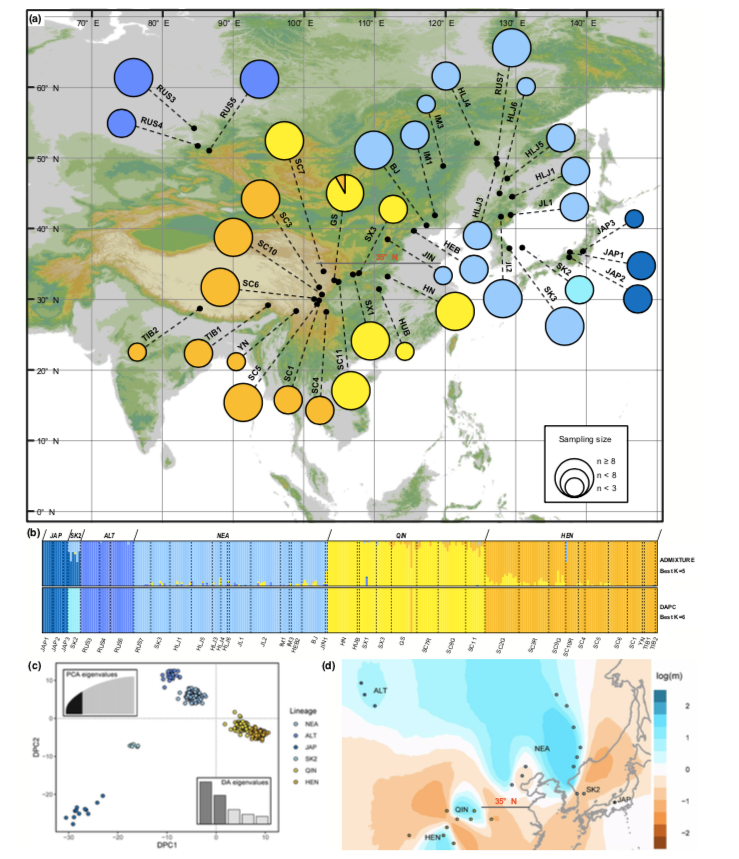 在今年3月份發(fā)表在Molecular Ecology(IF = 6.185)上的題為“Ecological adaptation shaped the genetic structure of homoploid ferns against strong dispersal capacity”的研究中,中國科學(xué)院植物植物研究所張憲春研究組利用SLAF-seq對中華蹄蓋蕨復合群Athyrium sinense complex進(jìn)行簡(jiǎn)化基因組測序,獲取全基因組范圍內有代表性的SNP變異位點(diǎn),對其群體遺傳結構進(jìn)行分析,揭示了蕨類(lèi)植物孢子強擴散能力下生態(tài)適應塑造的遺傳分化格局。
