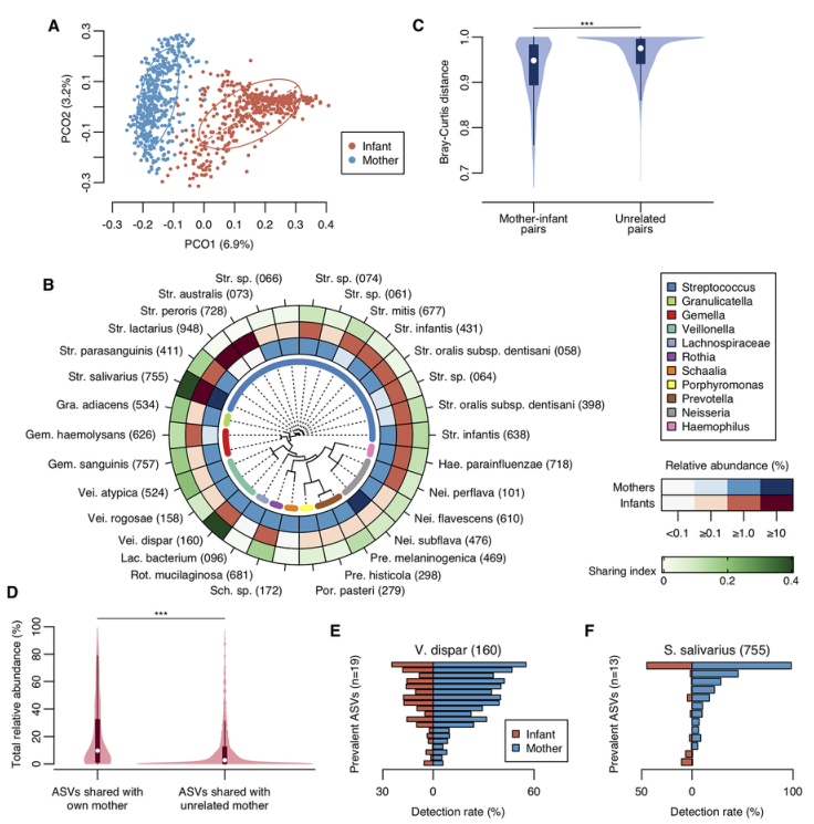 (A)?基于BrayCurtis距離的母親和嬰兒樣本的PCoA圖。(B)優(yōu)勢OTU的平均相對豐度和共享指數。(C)母嬰配對(n=448)和無(wú)關(guān)母嬰配對(n=198,464)的Bray-Curtis距離的小提琴曲線(xiàn)圖。(D)每名嬰兒與親生母親(n=448)和與無(wú)親緣關(guān)系的母親(n=198,464)分享的ASV總相對豐度的小提琴曲線(xiàn)圖。(E,F)與Veillonella dispar和?Streptococcus salivarius相對應的ASV的分布。