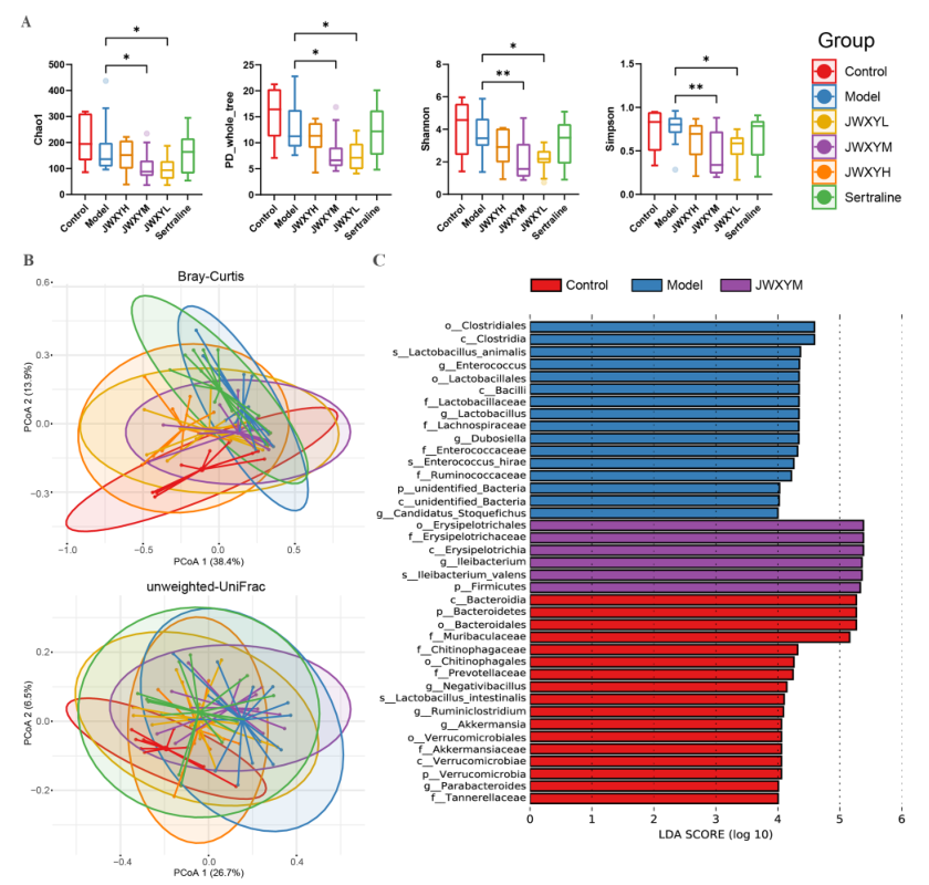 圖3.(A)不同群體的阿爾法多樣性指數(Chao1、PD_Whole_Tree.、Shannon、Simpson)的變化。(B)不同組樣本的beta多樣性指數(Bray-Curtis,未加權UniFrac)的特征。(C)基于對照組、模型組和JWXYM組之間的Lefse分析,確定腸道微生物組的潛在生物標志物。