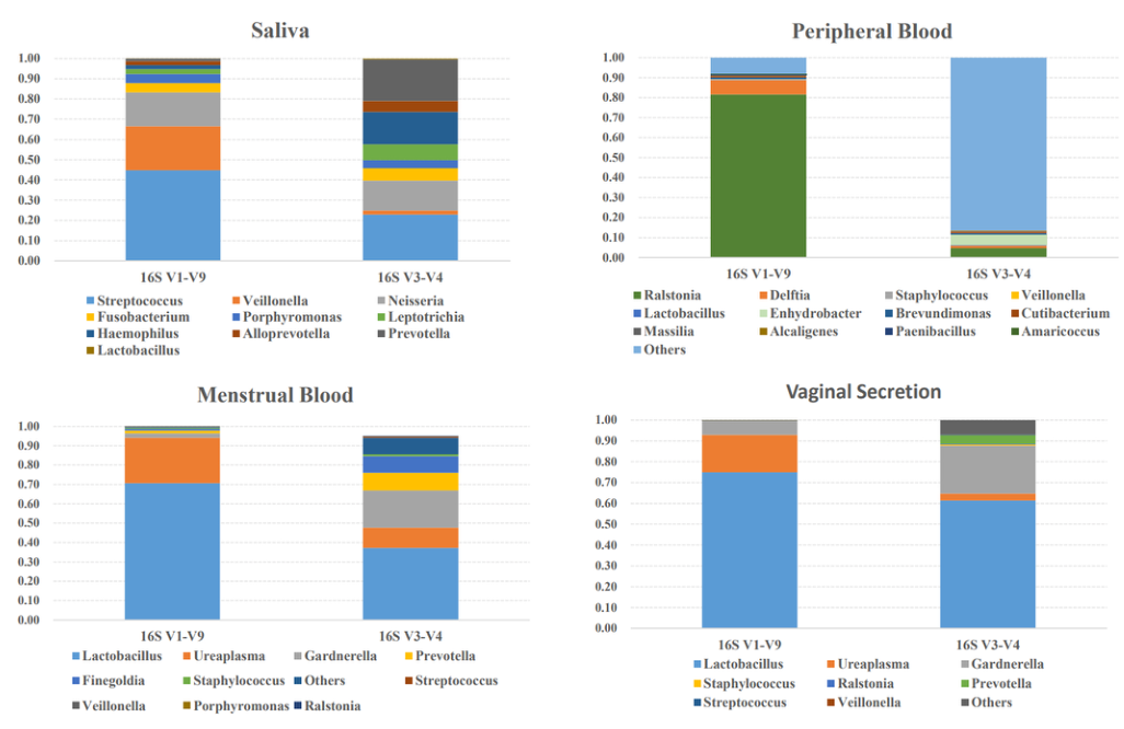 方法:采用二代16S rRNA基因V3-V4短讀長(cháng)測序和基于單分子實(shí)時(shí)測序的16S rRNA基因全長(cháng)測序,對唾液、外周血、陰道分泌物和月經(jīng)血中的微生物進(jìn)行分類(lèi)。