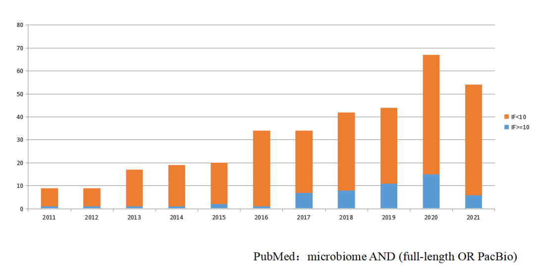 根據PubMed檢索結果,我們可以看到運用全長(cháng)微生物多樣性發(fā)表的文章逐年遞增。一方面隨著(zhù)測序技術(shù)也越來(lái)越成熟;另一方面PacBio sequel II通量的提升使得研究成本大幅降低,全球越來(lái)越多的研究學(xué)者開(kāi)始采用全長(cháng)微生物多樣性測序來(lái)進(jìn)行微生物組學(xué)研究。