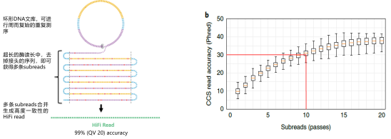 PB全長(cháng)多樣性測序基于HIFI模式對單一片段進(jìn)行多輪測序的方式來(lái)提升準確性。由于PacBio的原始錯誤為隨機錯誤,可通過(guò)獲取CCS(Circular Consensus Sequencing)進(jìn)行自身糾正來(lái)提升數據的準確性。