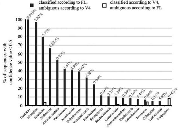 橫軸表示物種,縱軸表示豐度,黑色柱子表示全長(cháng)16S鑒定準確而V4區測序失真;白色柱子表示V4區鑒定準確而全長(cháng)16S結果失真,對比可以看出,全長(cháng)16S的覆蓋度和準確度更高。E Singer et al.?ISME J