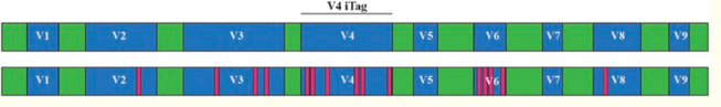 細菌16S rRNA基因全長(cháng)約1,550個(gè)堿基對,由8個(gè)高度保守區和9個(gè)高變區(這些區域命名為V1至V9;圖1)組成。在進(jìn)行16S rRNA基因測序研究時(shí),二代測序由于讀長(cháng)限制,往往使用通用引物擴增一個(gè)或幾個(gè)高變區,而PacBio全長(cháng)16S測序能夠一次獲得V1-V9區9個(gè)高變區序列,從而個(gè)獲得更多信息,在種水平注釋具有重要優(yōu)勢。尤其中在醫學(xué)領(lǐng)域,全長(cháng)16S rRNA基因測序已得到廣泛運用,其中包括人腸道菌群研究、皮膚、鼻腔、母乳、癌組織、宮腔、口腔等。