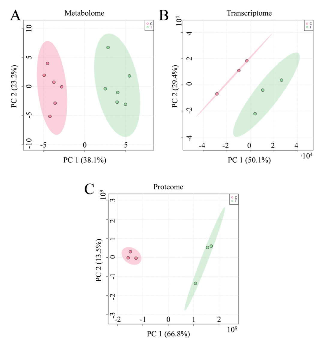 圖1?代謝組(a)、轉錄組(b)和蛋白質(zhì)組(c)的主成分分析