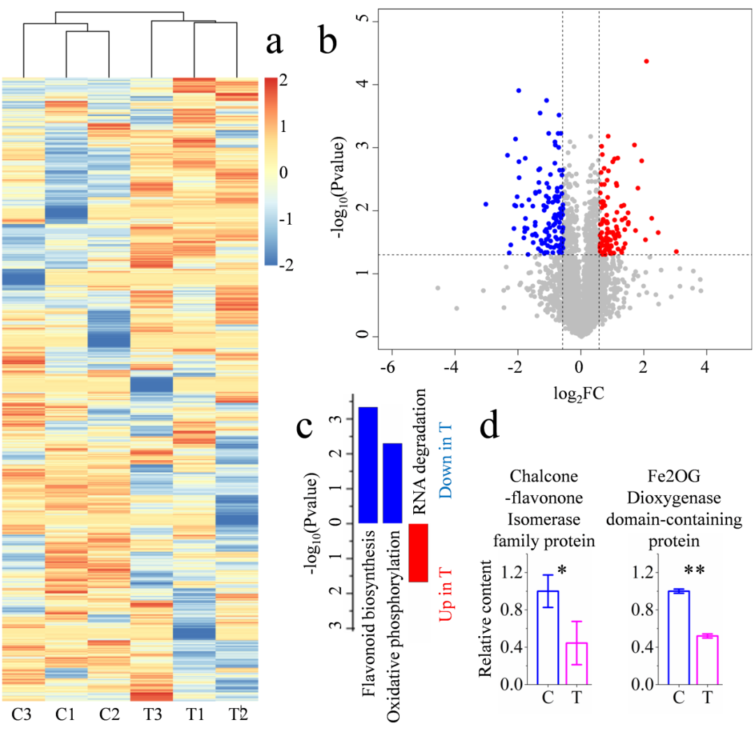與對照組相比,在四環(huán)素處理下有273種蛋白質(zhì)發(fā)生了顯著(zhù)變化(P<?0.05)。KEGG富集分析發(fā)現,這些差異蛋白與類(lèi)黃酮生物合成、氧化磷酸化、RNA降解、植物晝夜節律和α?-亞麻酸代謝相關(guān)。最顯著(zhù)的是,在四環(huán)素脅迫下,與RNA降解相關(guān)的蛋白顯著(zhù)增加(P?<?0.05,增加80%以上)。黃酮類(lèi)化合物的生物合成和氧化磷酸化顯著(zhù)減少(P?<?0.05,下降80%以上)。與轉錄組結果一致,黃酮類(lèi)化合物的生物合成通路也是顯著(zhù)降低。