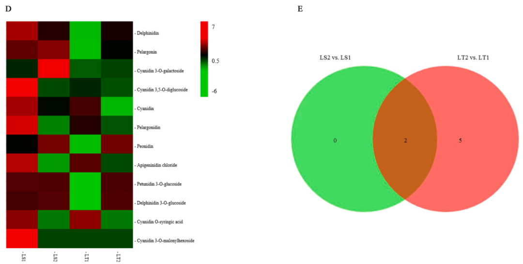 為了進(jìn)一步檢測花青素的類(lèi)型,將花青素與代謝物數據庫進(jìn)行比較。其中兩種花青素,即花青素O-丁香酸和芹菜苷氯化物,在葉芽中表現出較高的含量,其他花青素在葉片發(fā)育期間保持在穩定水平(圖4D)。從“Tailihong”的葉片中鑒定出11種花青素。其中三種花青素,即芹菜苷氯化物、花青素和花青素O-丁香酸隨著(zhù)成熟過(guò)程而減少。相反,四種花青素,即飛燕草素3-O-葡萄糖苷、天竺葵素、牡丹素和矮牽牛素3-O-葡萄糖苷,隨著(zhù)葉片發(fā)育而增加(圖4D)。多重比較表明,氰基鄰丁香酸和芹菜素氯化物在兩個(gè)紫葉品種的葉芽著(zhù)色中起著(zhù)關(guān)鍵作用(圖4E)