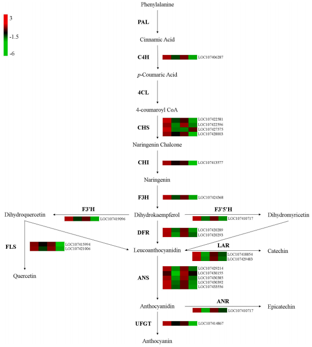 根據代謝組學(xué)分析結果,黃酮類(lèi)化合物是棗葉中的主要代謝產(chǎn)物,并決定了棗葉的顏色。在“Sanbianhong”中,在LS1和LS2之間檢測到20個(gè)差異表達的類(lèi)黃酮結構基因,并且所有基因都隨著(zhù)葉片發(fā)育而減少(圖5)。同樣,在成熟過(guò)程中,“Tailihong”中19個(gè)類(lèi)黃酮結構基因的表達大幅下降(圖5)。此外,“Sanbianhong”中差異表達的類(lèi)黃酮結構基因大部分與“Tailihong”中的DEGs重疊,包括一個(gè)C4H基因、兩個(gè)CHS基因、一個(gè)CHI基因、一個(gè)F3H基因、一個(gè)F3′H基因、一個(gè)F3′5′H基因、一個(gè)FLS基因、兩個(gè)DFR基因、兩個(gè)LAR基因、四個(gè)ANS基因和一個(gè)UFGT基因。