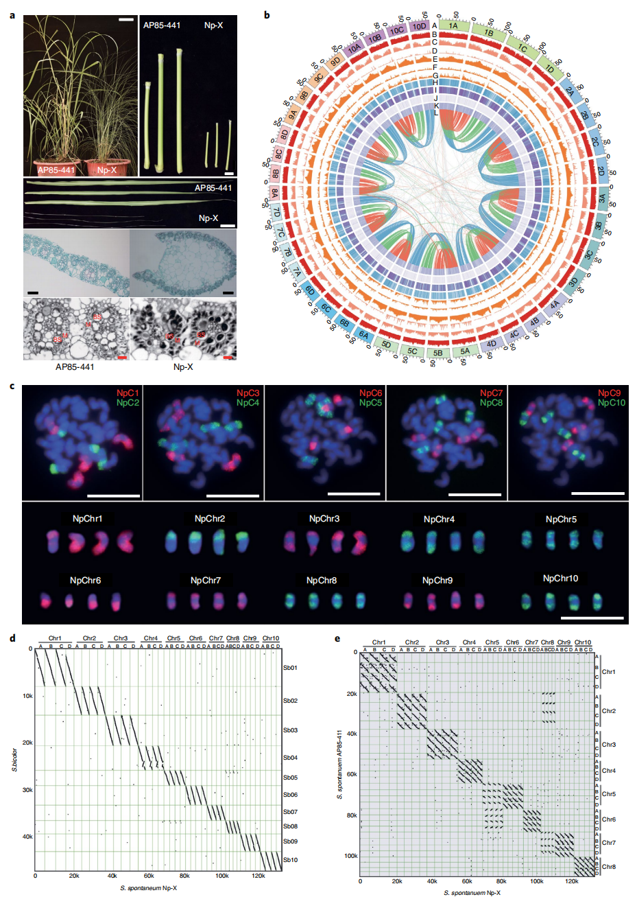 甘蔗屬是具有重要經(jīng)濟價(jià)值的作物,但其遺傳背景極其復雜,限制了甘蔗的進(jìn)一步育種改良。具有廣泛分布的甘蔗細莖野生種割手密(S. spontaneum)為現代栽培種甘蔗貢獻了抗逆、分蘗等優(yōu)良性狀,實(shí)現了甘蔗的育種史上大的突破。割手密倍性和染色體基數的廣泛變異是甘蔗育種重要的種質(zhì)資源,為研究植物同源多倍體基因組的進(jìn)化提供了一個(gè)良好的模型。如何將天然同源四倍體的四套同源基因組完整組裝?不同倍性與染色體基數如何演化?這都是甘蔗基因組研究有趣和重要的地方也是難以攻破之處。本次研究在構建高質(zhì)量基因組的基礎上進(jìn)一步解析了甘蔗復雜的演化之路:(1)本次研究完成了割手密 Np-X(2n=4x=40)高質(zhì)量同源多倍體基因組測序,完整的組裝了10組同源染色體的共40條染色體基因組。(2)Saccharum中的一對古復制染色體NpChr5和NpChr8經(jīng)歷了分裂,隨后融合并伴隨著(zhù)著(zhù)絲粒分裂。重組時(shí)帶有著(zhù)絲粒結構的染色體片段融合入另外一條完整的染色體,導致x = 8中出現“雙著(zhù)絲?!爆F象。(3)甘蔗分別在6.4 Mya和4.0 Mya時(shí)與高粱和芒草發(fā)生分化。在甘蔗中,割手密與S. officinarum在~1.6 Mya發(fā)生分化,兩個(gè)割手密材料Np-X(x=10)和AP85-441(x=8)在~0.8 Mya分化,表明AP85-441中的染色體減少是最近發(fā)生的。比較基因組結合轉錄組共同解析兩個(gè)甘蔗種“近期”獨立分化的且與糖分代謝、生物量、光合等相關(guān)的基因,為甘蔗的分子輔助育種提供重要的理論指導。(4)研究推斷Np-X(x=10)有可能代表祖先的核型,核型x=9和x=8可能是以逐步方式進(jìn)化而來(lái)。割手密起源于印度北部的一個(gè)x=10的祖先,然后傳播到印度次大陸、中國和東南亞的四個(gè)主要群體。在染色體減少過(guò)程中,基因組中受自然選擇區可能參與多糖代謝和脅迫耐受過(guò)程。