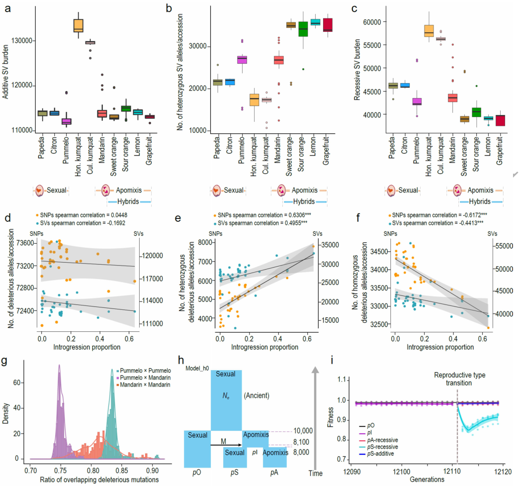 柑橘通過(guò)珠心進(jìn)行無(wú)融合生殖,保留了母體基因型,這可能導致基因組中有害突變和結構變異(SVs)的積累。從234份材料中共鑒定出139,241個(gè)可靠的SVs,其中64.2%為缺失,16.6%為重復,15.5%為易位。山金柑的SV數量最高,可能與有效種群大小減少有關(guān)(圖3a)。具有無(wú)融合生殖的雜交群體的雜合有害變異約為有性生殖群體的1.45倍。隨后提出了雜種無(wú)融合生殖將SVs隱藏在雜合子狀態(tài)的假說(shuō),這可能主要是隱性選擇造成的危害。因此,有性生殖的雜種可能會(huì )迅速以隱性純合的方式暴露有害變異。這個(gè)假說(shuō)解釋了為什么無(wú)融合生殖和有性生殖的天然雜交樣本中觀(guān)察到的自然雜種通常是無(wú)融合生殖的。有害突變的模式與SVs的模式一致,即與有性生殖群體相比,無(wú)融合生殖群體的隱性有害負擔較低(7.39%),雜合子SVs較多(約2.62倍)。在隱性模型下,從無(wú)融合生殖到有性生殖的生殖模式轉變導致種群適應度在轉變后立即下降13.48±0.87%,但隨后恢復(圖3i)。相比之下,保持無(wú)融合生殖的種群保持種群適合度。