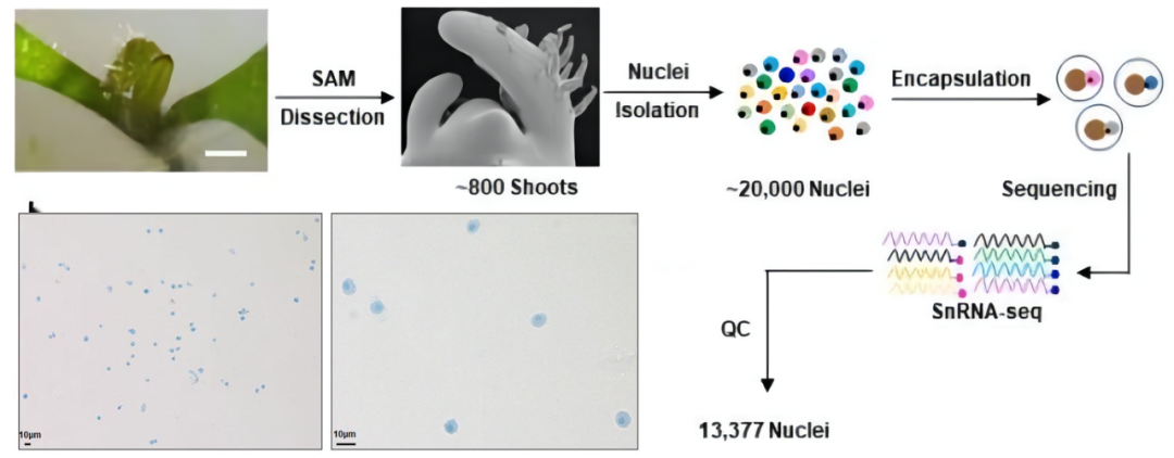 為了有效解決植物單細胞目前研究的桎梏,單細胞核轉錄組測序(single-nuclei RNA sequencing,snRNA-seq)應運而生。它是指通過(guò)提取細胞核,從而在單細胞水平研究基因表達的技術(shù)。