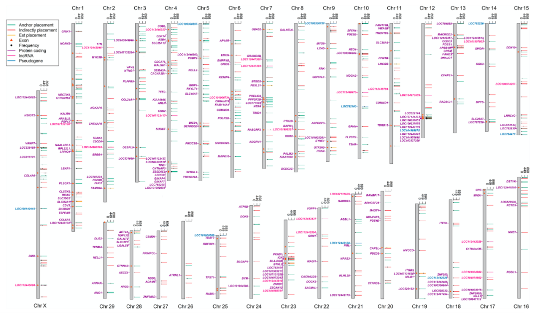 為解決以上問(wèn)題,該文章通過(guò)開(kāi)發(fā)新的基因組分析流程,對來(lái)自世界57個(gè)品種898頭牛的基因組序列進(jìn)行組裝和SV檢測;發(fā)現了83Mb的?;蚪M未知序列,相當于目前參考基因組序列總長(cháng)度的3.1%,并且從中鑒定出大量未知外顯子序列,最后綜合三種策略成功將1007條contig放置在現有參考基因組上,這些序列可能通過(guò)外顯子破壞、外顯子添加等方式影響了279個(gè)基因的序列結構。