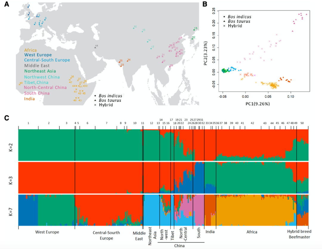 圖3利用SV(缺失型變異)對世界牛品種展開(kāi)精準群體學(xué)分析