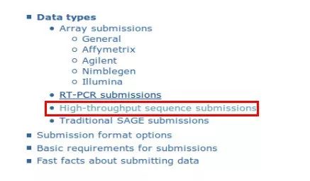 GEO數據庫支持上傳芯片數據、高通量數據以及RT-PCR數據等,首先選擇需要上傳數據的類(lèi)型,接下來(lái)以high-throughput sequence submisssions (高通量測序)為例進(jìn)行詳解。