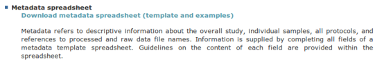 可以看見(jiàn)我們上傳數據需要準備三個(gè)文件,分別為:Metadata spreadsheet、Processed data files、Raw data files。下面分別介紹每個(gè)文件如何填寫(xiě)以及準備。