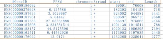 如果表達量文件包含新預測的基因,還需要補充新基因(已知基因可選填)的Chromosome(染色體號)、Strand(正負鏈信息)、start(起始位置)、end(終止位置)、length(長(cháng)度)。
