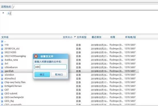 連接成功后,在遠程站點(diǎn)下的文件名展示中創(chuàng )建自己的文件,在fasp目錄下面創(chuàng )建自己的目錄(當然也可以與fasp目錄同級下創(chuàng )建),例如ABC,創(chuàng )建方法為點(diǎn)擊鼠標右鍵,會(huì )出現下圖中的創(chuàng )建空文件夾對話(huà)框,輸入自己文件夾的命名,之后點(diǎn)擊確認,這樣你的文件夾就創(chuàng )建成功了。