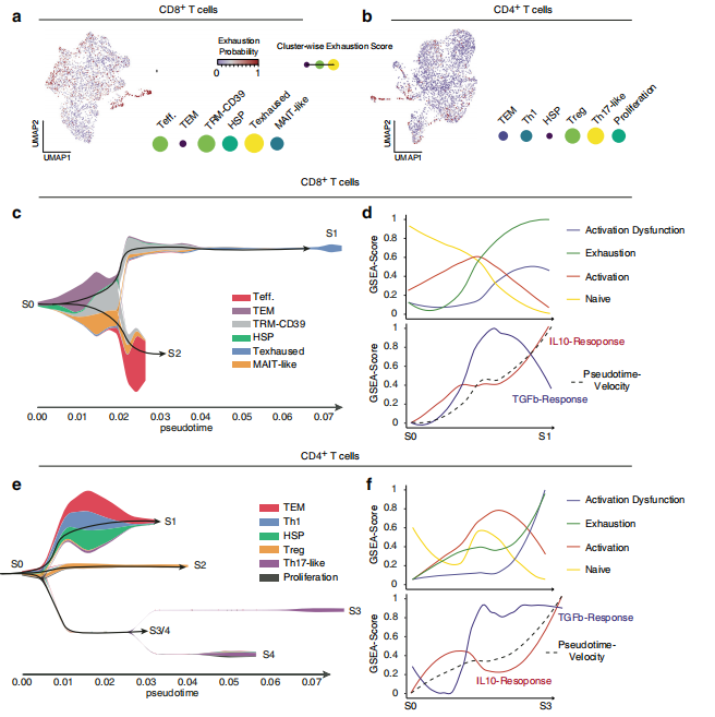 該團隊對?8?名診斷為新發(fā)膠質(zhì)母細胞瘤的患者腫瘤組織樣本進(jìn)行了單細胞測序和數據分析,發(fā)現“S1”狀態(tài)與?T?細胞耗竭/功能障礙標志物(HAVCR2、CTLA4?和?PDCD1)的表達增加,為了確定與?T?細胞耗竭相關(guān)的轉錄途徑,進(jìn)行了通路信號傳導推斷,揭?示了?T?細胞耗竭與?IL-10?以及部分?TGF??反應之間存在著(zhù)相關(guān)性。