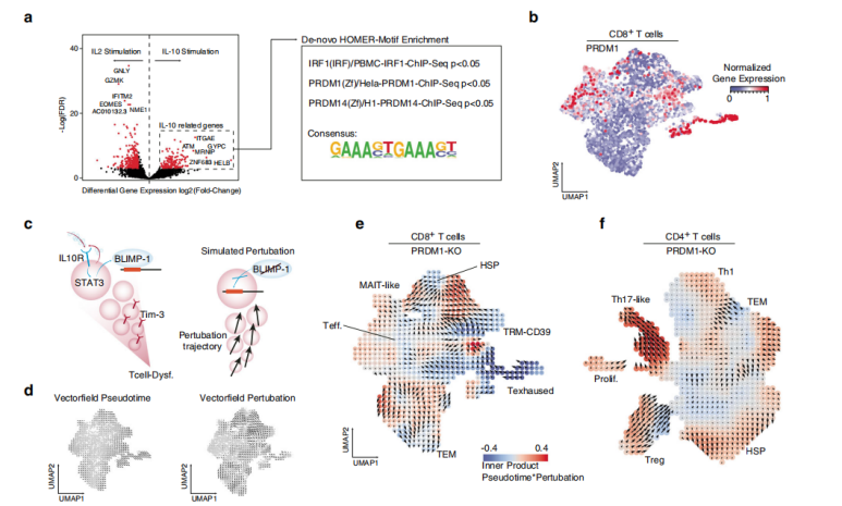該團隊通過(guò)擾動(dòng)模擬,用IL-10刺激所產(chǎn)生scRNA-seq數據集富集分析推斷常見(jiàn)轉錄因子結合位點(diǎn),發(fā)現ChiP-seq數據中基因BLIMP-1和IRF1峰之間密切重疊,IRF1和PRDM1/14結合位點(diǎn)的顯著(zhù)富集,提出了“IL10-STAT3-BLIMP-1信號軸可能是腫瘤相關(guān)T細胞耗竭的潛在驅動(dòng)因素”的假設。為了進(jìn)一步驗證猜想,作者對PRDM1進(jìn)行了計算機擾動(dòng)模擬驗證,發(fā)現膠質(zhì)瘤母細胞瘤微環(huán)境中髓樣細胞分泌IL-10驅動(dòng)誘發(fā)T?細胞耗竭。