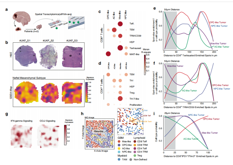 為了確定?T?細胞簇的空間位置信息,以及與特定腫瘤狀態(tài)共定位信息,作者進(jìn)行了空間分辨轉錄組RNA測序(stRNAseq)。該團隊收集3名原發(fā)性GBM IDH1/2 Wt患者組織樣本,數據集總共包含2352個(gè)測序點(diǎn),每個(gè)點(diǎn)的中位數為8個(gè)細胞(范圍:每個(gè)spot點(diǎn)捕獲4~22個(gè)細胞)。作者通過(guò)NMF回歸和Moran統計分析,發(fā)現CD8+T細胞簇與GBM亞型相關(guān)聯(lián),腫瘤區域富集為間充質(zhì)樣腫瘤(MES樣),星形膠質(zhì)細胞樣(AC樣)轉錄特征與活化的CD8+效應子、CD8+T耗盡簇共定位。