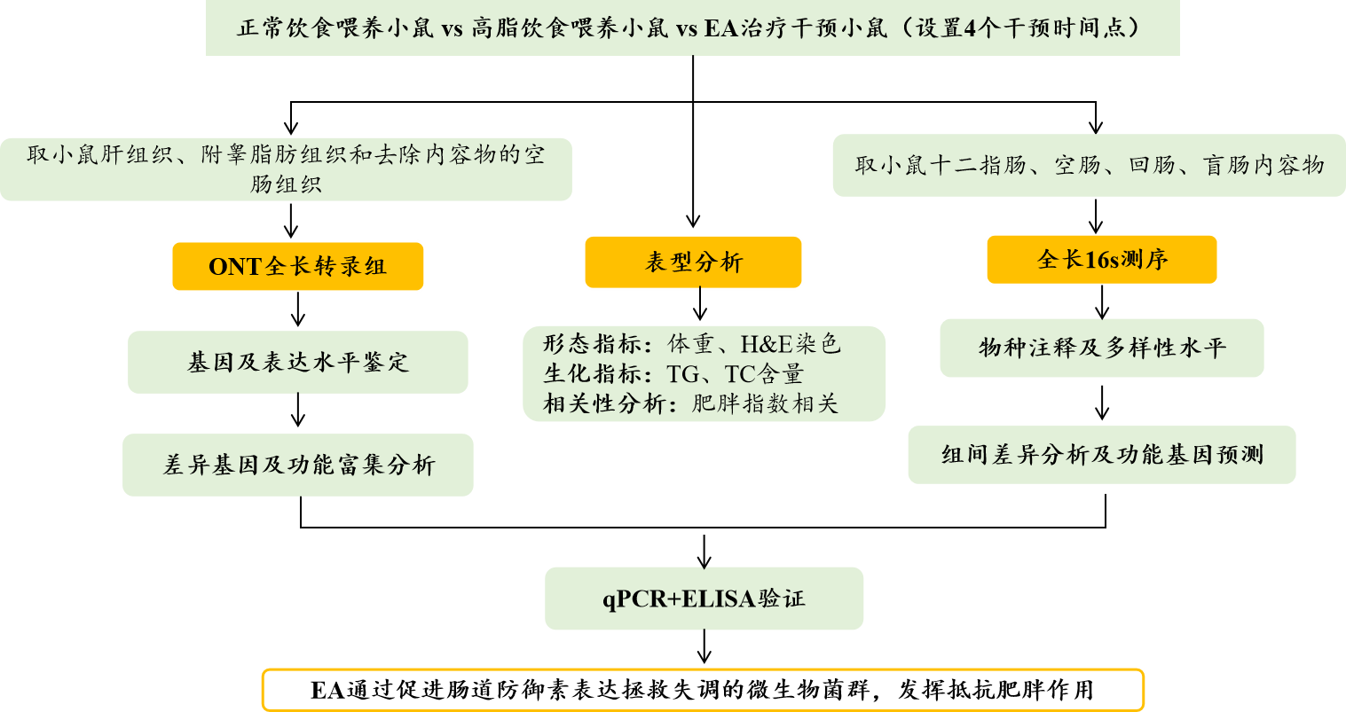 肥胖作為一種不斷增長(cháng)的非傳染性流行病,影響了超過(guò)20億人。腸道微生物菌群失調已被證明是肥胖和肥胖相關(guān)疾病發(fā)生和進(jìn)展的關(guān)鍵因素,包括高血壓、II型糖尿病、血脂異常和非酒精性脂肪性肝?。∟AFLD)。針灸已被廣泛用于治療肥胖癥,研究報道,電針(EA)可以減輕肥胖小鼠的體重,挽救生態(tài)失調的腸道微生物群,還可以調節免疫力。然而,EAEA重塑腸道微生物群的潛在機制尚不清楚,如何通過(guò)腸道微生物菌群調節腸道先天免疫力對抗肥胖仍有待闡明。