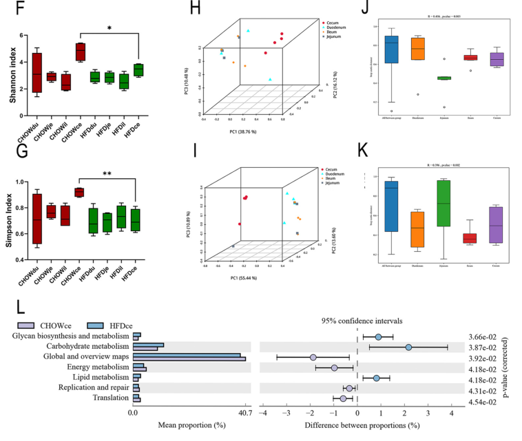 α多樣性分析結果顯示,高脂飲食HFD組與正常對照組的十二指腸、空腸和回腸微生物多樣性沒(méi)有顯著(zhù)差異,但在盲腸中HFD組微生物多樣性顯著(zhù)減少(圖1F, 1G);β多樣性分析結果顯示,與其他腸道段相比,只有盲腸微生物菌群在HFD組與正常對照組表現出顯著(zhù)差異(圖1H, 1I);此外,top 15的KEGG通路中有7個(gè)是基于微生物功能富集,高脂飲食組盲腸微生物的上調通路包括脂質(zhì)代謝、碳水化合物代謝和聚糖生物合成和代謝,下調通路包括能量代謝相關(guān)途徑(圖1L)。
