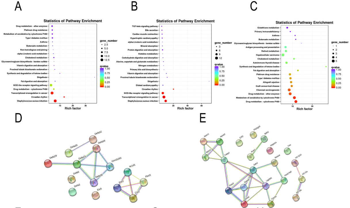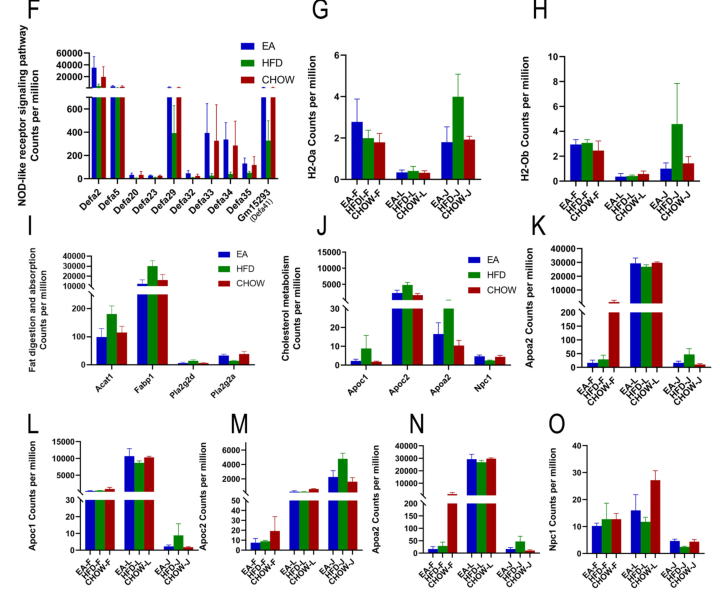 對共有DEG進(jìn)行功能富集分析,發(fā)現顯著(zhù)富集的通路主要與宿主先天防御和脂質(zhì)代謝相關(guān)(圖3A);在去除功能未鑒定的基因或lncRNA后,獲得140個(gè)上調和92個(gè)下調的DEG也進(jìn)行功能富集分析(圖3B, 3C);然后,對top20通路的DEG進(jìn)行PPI調控網(wǎng)絡(luò )分析(圖3 D, 3E),結果顯示,EA主要上調的通路包括α防御素基因在內的NOD樣受體信號通路(圖3 D),下調的通路脂質(zhì)代謝(包括脂質(zhì)消化和吸收途徑),以及免疫應答相關(guān)通路(谷胱甘肽s-轉移酶和MHC II類(lèi)相關(guān)基因)(圖3E)?;虮磉_直方圖顯示EA干預恢復大量異常表達的DEG,與腸粘膜免疫相關(guān)的DEG,如α防御素基因,可以通過(guò)EA顯著(zhù)恢復(圖3F);與免疫反應相關(guān)的H2-Ob和H2-OA僅在空腸區域下調(圖3G, 3H);EA干預恢復了fabp1、pla2g2d和acat1的表達水平,主要負責脂肪消化和吸收(圖3I);最后,EA干預通過(guò)下調apoc1、apoa2和apoc2以及上調npc1來(lái)調節膽固醇代謝(圖3J-O)。