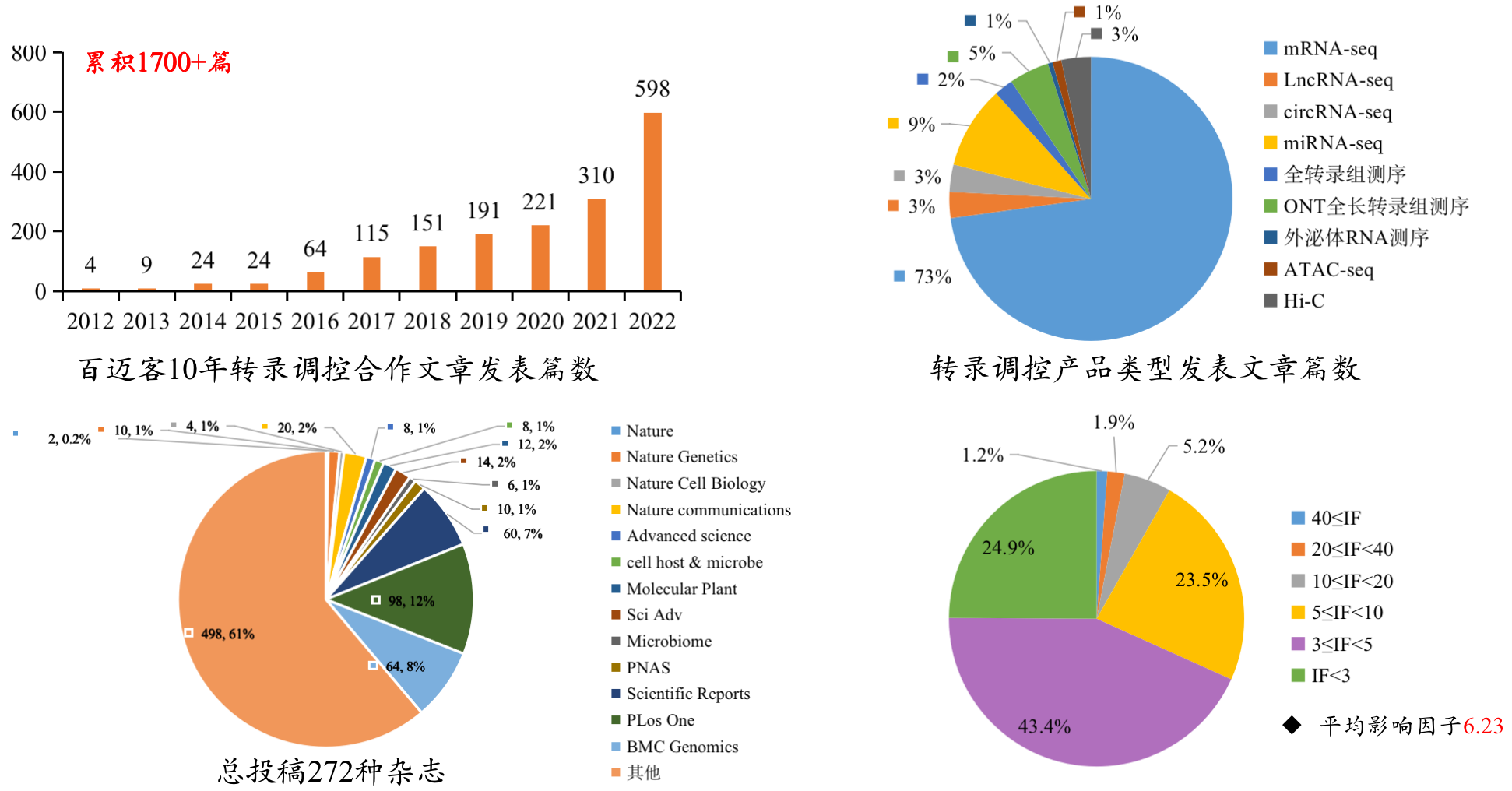 百邁客轉錄調控合作項目文章持續爆發(fā)增長(cháng),累積1700篇,2022年度收錄598篇,總IF高達3500+,平均影響因子6.23。