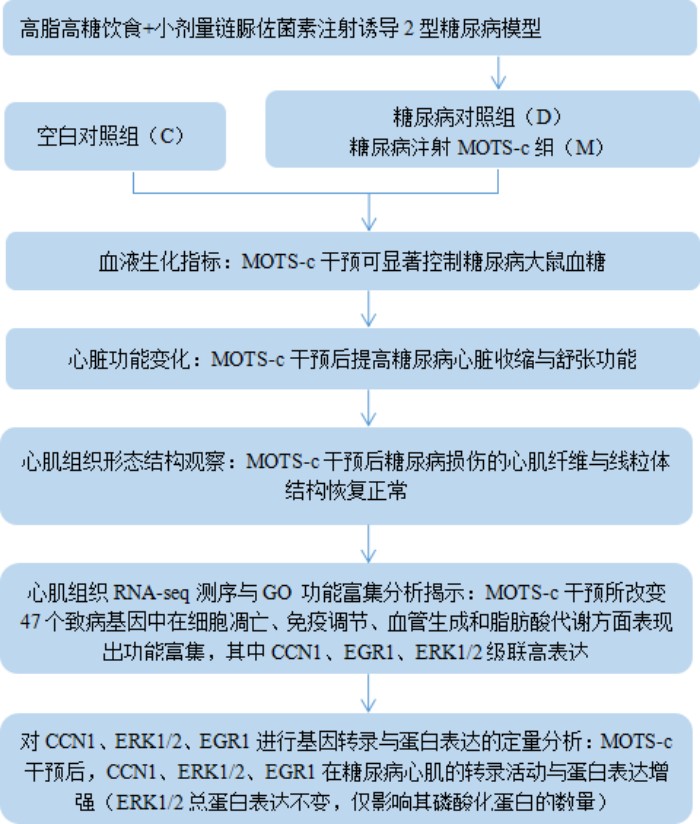 心臟重構和功能障礙是糖尿病常見(jiàn)的并發(fā)癥,常導致嚴重的心血管事件。MOTS-c是一種線(xiàn)粒體衍生肽,通過(guò)加速葡萄糖攝取和提高胰島素敏感性來(lái)調節代謝穩態(tài)。目前發(fā)現,MOTS-c不僅可改善心臟與血管內皮功能,且其含量在糖尿病患者血漿中明顯下降,使其成為糖尿病心血管并發(fā)癥的一個(gè)新的治療靶點(diǎn)。所以,該研究旨在探究MOTS-c對糖尿病心臟結構與功能的影響并利用轉錄組學(xué)技術(shù)挖掘其中的分子機制。