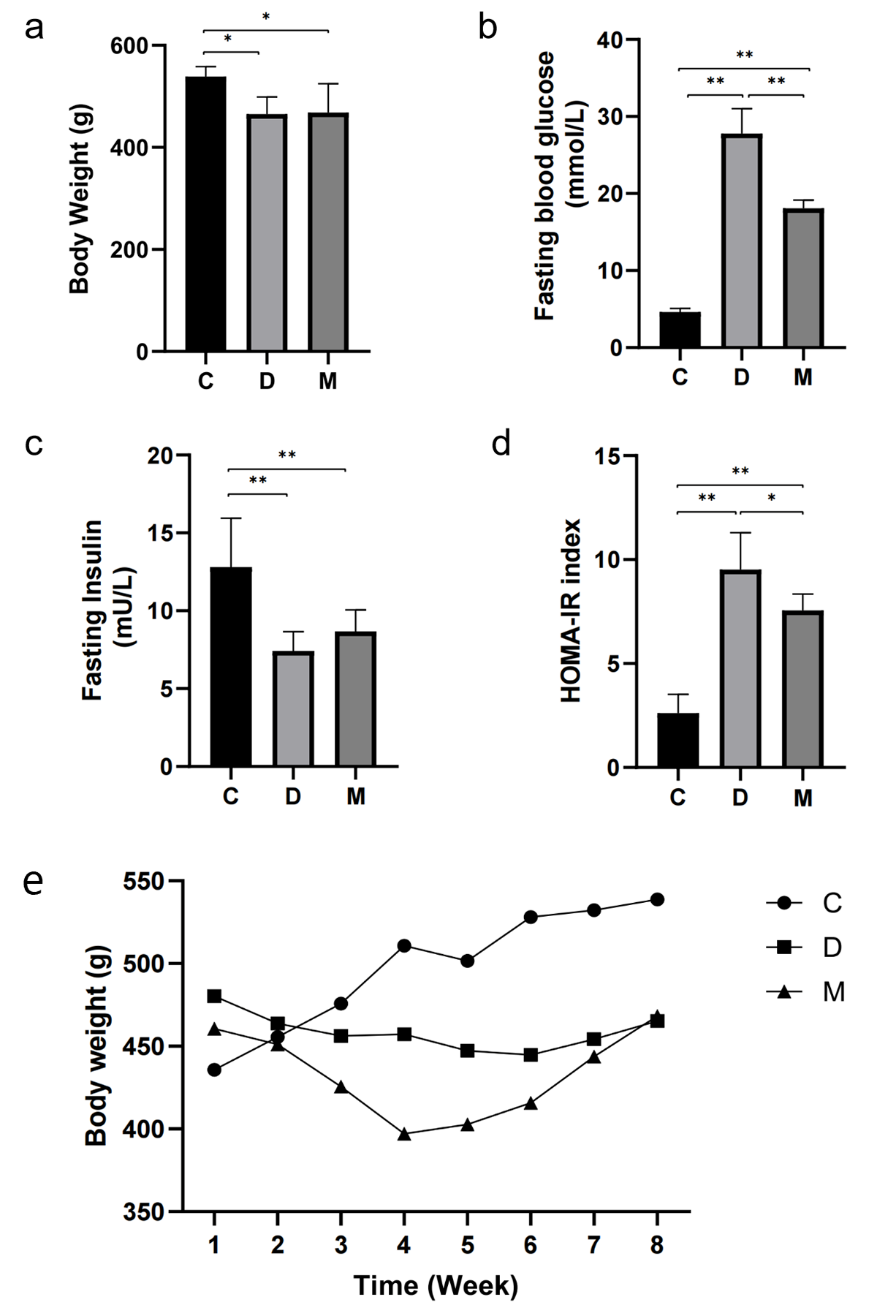 MOTS-c治療8周后,D組和M組大鼠體重低于C組(圖1a和圖1e)。與D組相比,M組大鼠空腹血糖水平降低(圖1b)。此外,與C組相比,D組和M組大鼠胰島素水平下降,D組和M組間胰島素水平無(wú)顯著(zhù)差異(圖1c)。通過(guò)計算HOMA-IR指數評估胰島素抵抗。與C組相比,D組大鼠的HOMA-IR指數顯著(zhù)升高,而M組大鼠HOMA-IR指數較D組降低。