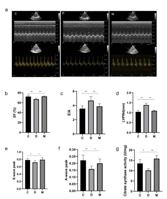 該研究利用透射電鏡測定了MOTS-c對糖尿病心肌超微結構的影響。糖尿病引起心肌纖維排列紊亂和線(xiàn)粒體結構的異常改變,包括心肌細胞排列不規則、嵴破裂、腫脹和空泡化(圖2)。MOTS-c治療糖尿病大鼠顯著(zhù)降低心肌線(xiàn)粒體損傷,改善心肌纖維和線(xiàn)粒體結構(圖2)。研究還通過(guò)測定檸檬酸合酶的活性,測定了線(xiàn)粒體功能。D組大鼠檸檬酸合酶的活性顯著(zhù)降低,C組和M組的檸檬酸合酶的活性無(wú)統計學(xué)差異(圖3g)。