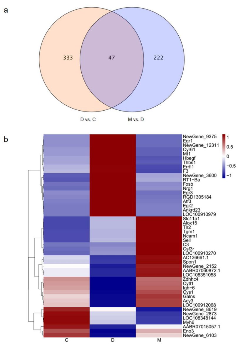 為了進(jìn)一步探究糖尿病大鼠對MOTS-c的適應性反應的機制,研究者利用RNA-Seq技術(shù),測定了心肌組織基因全長(cháng)轉錄表達。以C組為對照,D組表現出的差異表達基因(DEGs)即致病基因,再以D組為對照組篩選出M組的差異表達基因,二者篩選出的DEGs中重疊的基因即為MOTS-c改變的致病基因。將以上步驟執行,篩選出47個(gè)MOTS-c改變的致病基因(圖4a)。將這47個(gè)基因進(jìn)行熱圖分析后發(fā)現,C組基因表達趨勢與D組相反,而與M組近似(圖4b)。