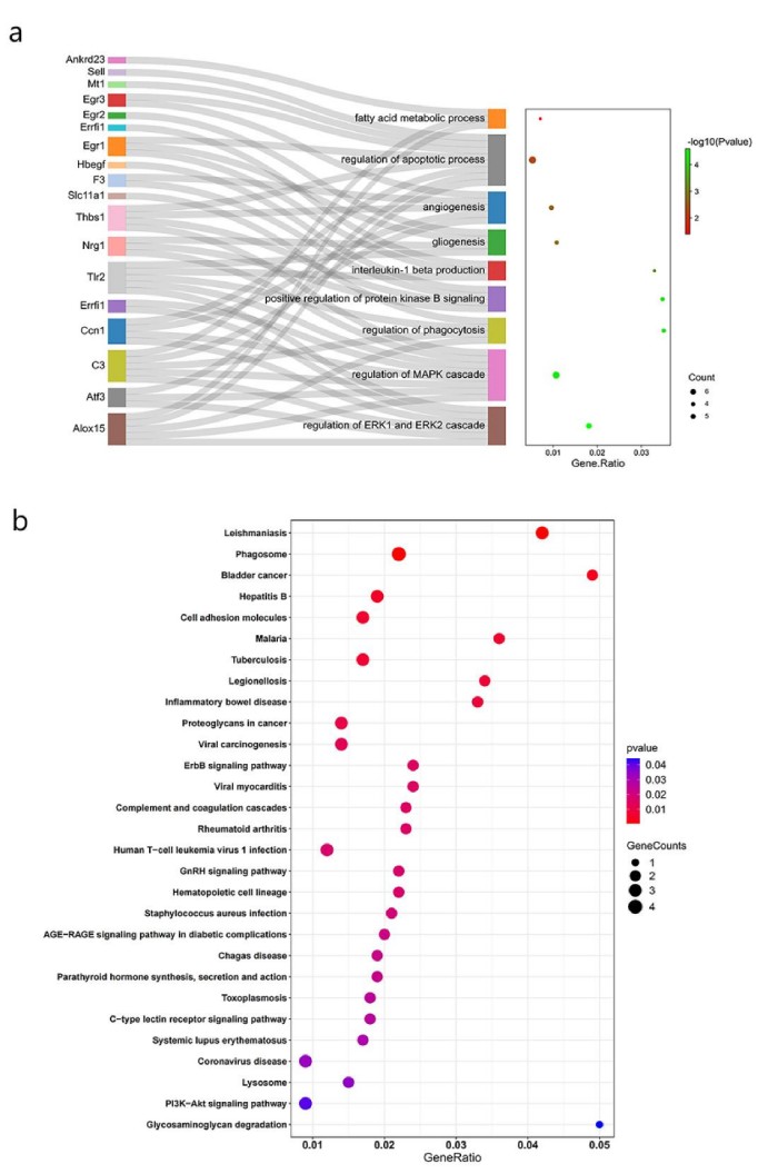 采用Gene Ontology(GO)與Kyoto Encyclopedia of Genes and Genomes(KEGG)對MOTS-c所改變的47個(gè)致病基因進(jìn)行功能富集分析。GO 注釋系統包含三個(gè)主要分支,即:生物學(xué)過(guò)程(BP)、分子功能(MF)和細胞組分(CC)。)8 周 MOTS-c 注射所改變的 47 個(gè)糖尿病致病基因共富集于 195 個(gè) GO term 中,其中 188 個(gè) term 富集于 BP,2 個(gè) term 富集于 CC,5 個(gè) term 富集于MF。經(jīng)過(guò) ClueGO 聚類(lèi)分析后,195 個(gè) term 主要富集于 9 個(gè)類(lèi)別(見(jiàn)圖 5b),分別為血管生成(angiogenesis)、凋亡過(guò)程調控(regulation of the apoptotic process)、MAPK 級聯(lián)調控(regulation of MAPK cascade)、蛋白激酶活性正調控(positive regulation of protein kinase activity)、脂肪酸代謝過(guò)程(fatty acid metabolic process)、吞噬作用調節(regulation of phagocytosis)、蛋白激酶 B 信號正調控(positive regulation of protein kinase B signaling)、ERK1/2 級聯(lián)(regulation of ERK1/2 cascade)、膠質(zhì)生成(gliogenesis)和白細胞介素-1 的產(chǎn)生(interleukin-1 beta production)。KEGG通路富集分析顯示,18條KEGG通路顯著(zhù)富集(圖5b),其中5條信號通路與免疫、凋亡和糖代謝相關(guān)(ErbB信號通路、補體和凝血級聯(lián)、c型凝集素受體信號通路、PI3K-Akt信號通路和AGE-RAGE信號通路)。在功能富集通路注釋基因中,ALOX15、ATF3、CCN1、EGR1、EGR3、ERRFI1、THBS1、TLR2和NRG1高頻率注釋。CCN1與EGR1基因高表達,同時(shí)均注釋在凋亡相關(guān)的GO term中,而CCN1也注釋于富集顯著(zhù)性最高的ERK1/2級聯(lián)通路中,表明CCN1、ERK1/2與EGR1可能是相互關(guān)聯(lián)的關(guān)鍵基因。