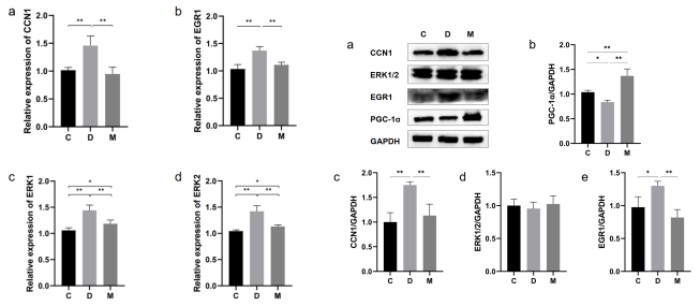 為了驗證CCN1、ERK1/2與EGR1是否在MOTS-c改善糖尿病心臟結構與功能中發(fā)揮重要作用,也為了進(jìn)一步探究MOTS-c對線(xiàn)粒體發(fā)生的作用,研究者利用RT-PCR與Western Blotting技術(shù)測定了CCN1、ERK1/2、EGR1的基因表達與蛋白表達以及線(xiàn)粒體發(fā)生標志蛋白PGC-1α的蛋白表達。結果表明,MOTS-c治療后,糖尿病大鼠心肌中PGC-1α蛋白表達顯著(zhù)上升(圖7a);CCN1、ERK1/2和EGR1基因表達顯著(zhù)降低(圖6);CCN1、EGR1蛋白表達顯著(zhù)降低,ERK1/2的總蛋白表達量不變(圖7),但多個(gè)研究表明MOTS-c僅影響ERK1/2的磷酸化水平。
