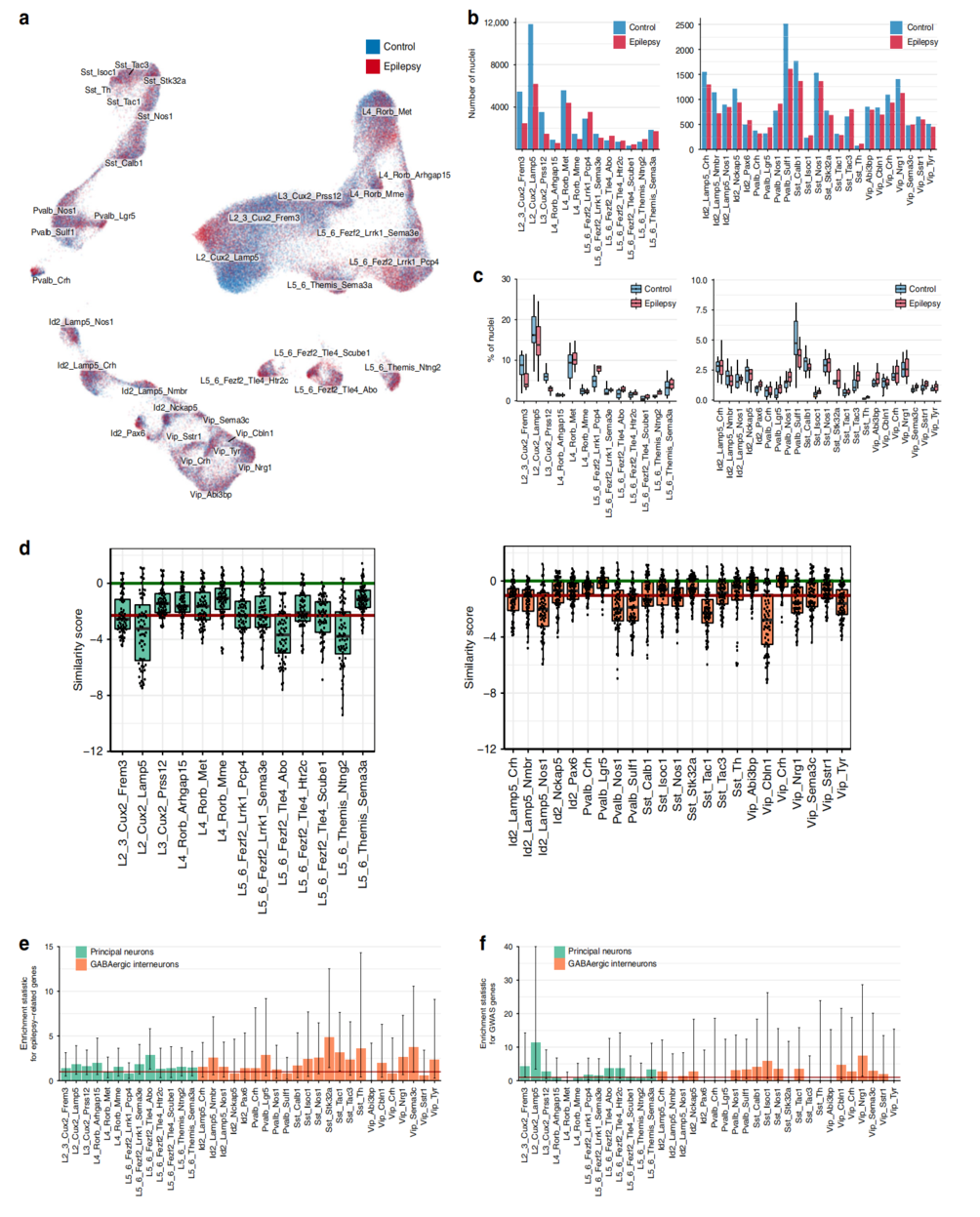 通過(guò)基因表達相關(guān)性分析,發(fā)現癲癇和非癲癇神經(jīng)亞型之間的巨大差異(圖1d),這可能表明癲癇對其轉錄組有特定的影響。對于主要神經(jīng)元,L5-6_Fezf2_Tle4_Abo、L5-6_Themis_Ntng2、L2_